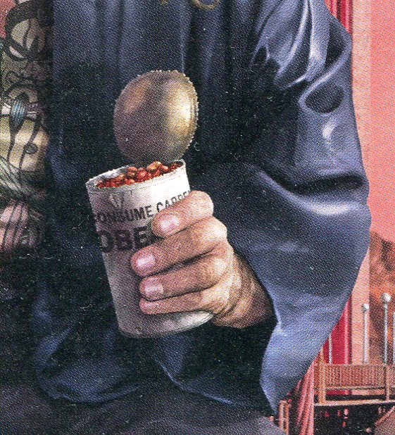 eating from a can of beans labeled with the words "consume" and